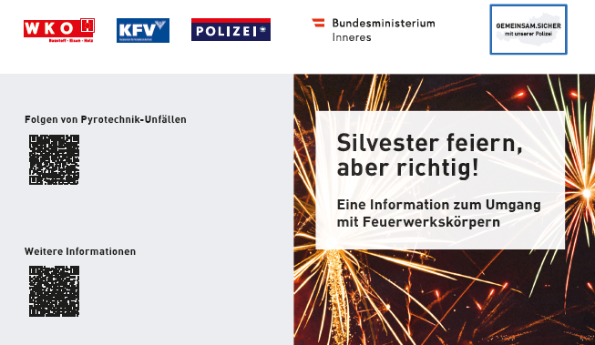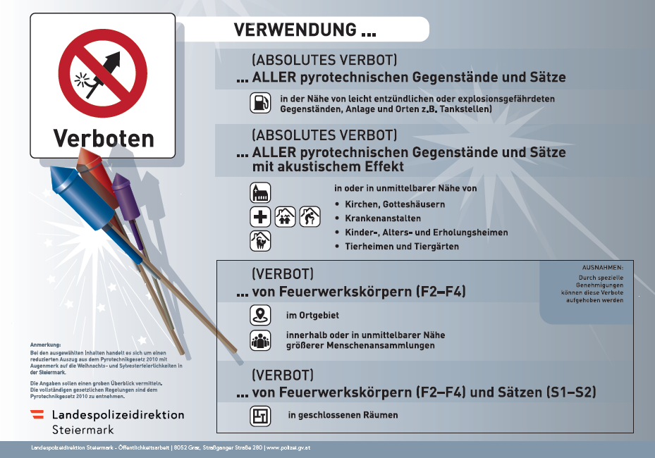 Anlässlich des bevorstehenden Jahreswechsels weisen wir auf die bundesweiten, gesetzlichen Bestimmungen hin, wonach das Abfeuern von Feuerwerken (pyrotechnische Gegenstände) der Kategorie F2 im Ortsgebiet generell verboten ist. Darunter fallen alle herkömmlichen im Handel zu erwerbenden Feuerwerke, die eine geringe Gefahr darstellen. Wir appellieren daher auch im Schutzinteresse aller Mitmenschen und Tiere, dieses Verbot zu beachten.