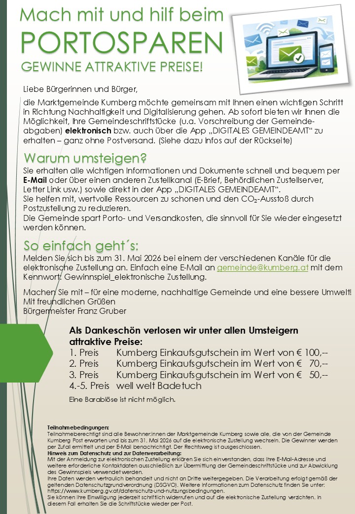 Sie erhalten gleichzeitig mit dieser Vorschreibung eine Information zur Umstellung auf eine elektronische Zustellung Ihrer Sendungen bzw. zur App „Digitales Gemeindeamt“.