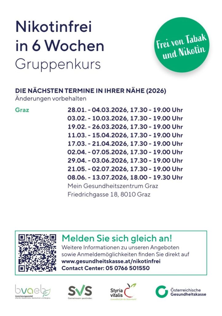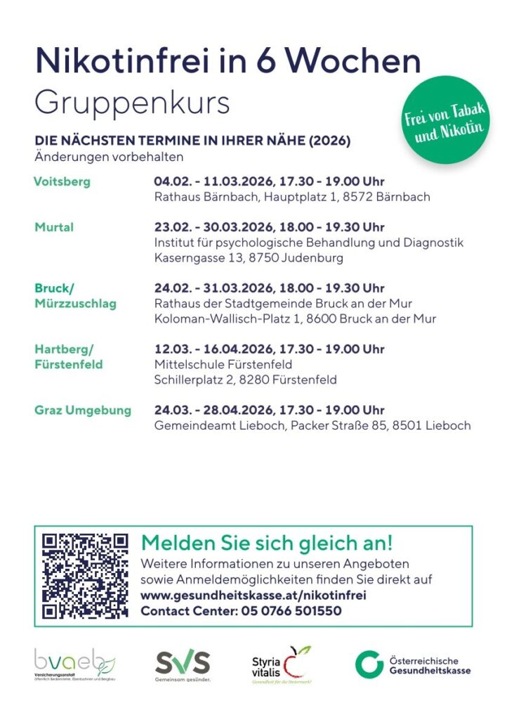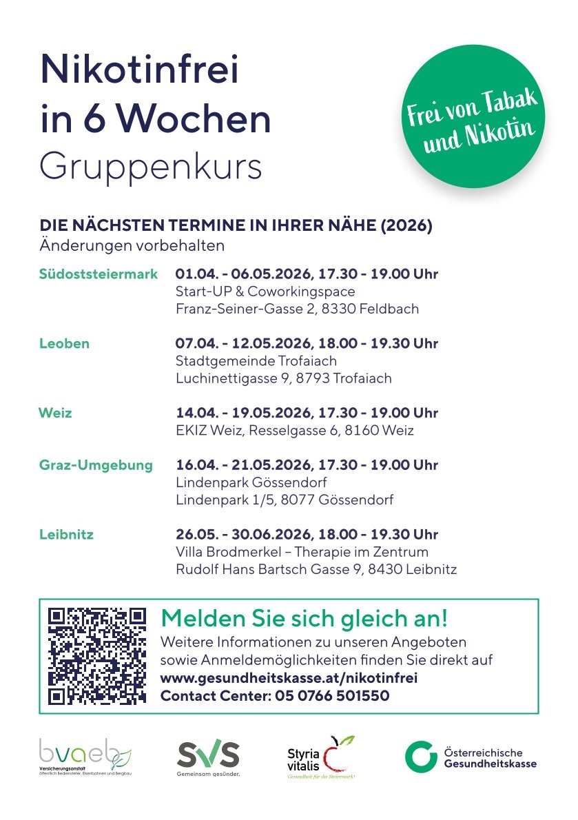 Nikotinfrei in 6 Wochen: Kostenfreie Kurse und Einzelentwöhnung in der ganzen Steiermark.