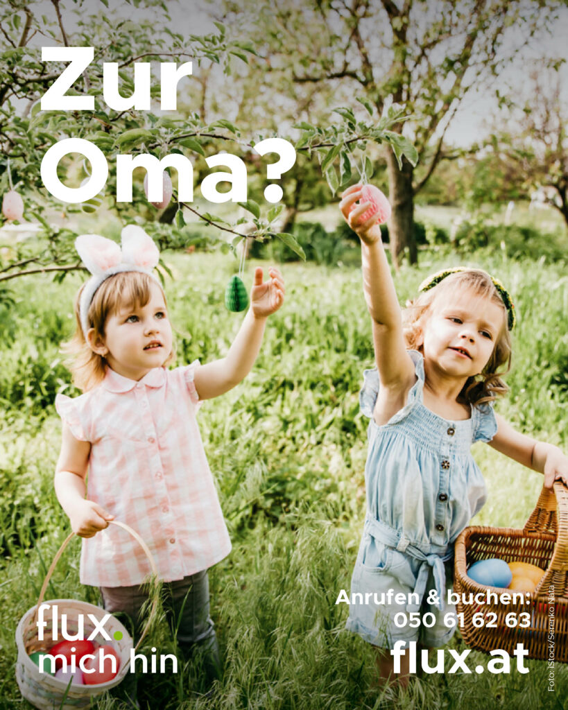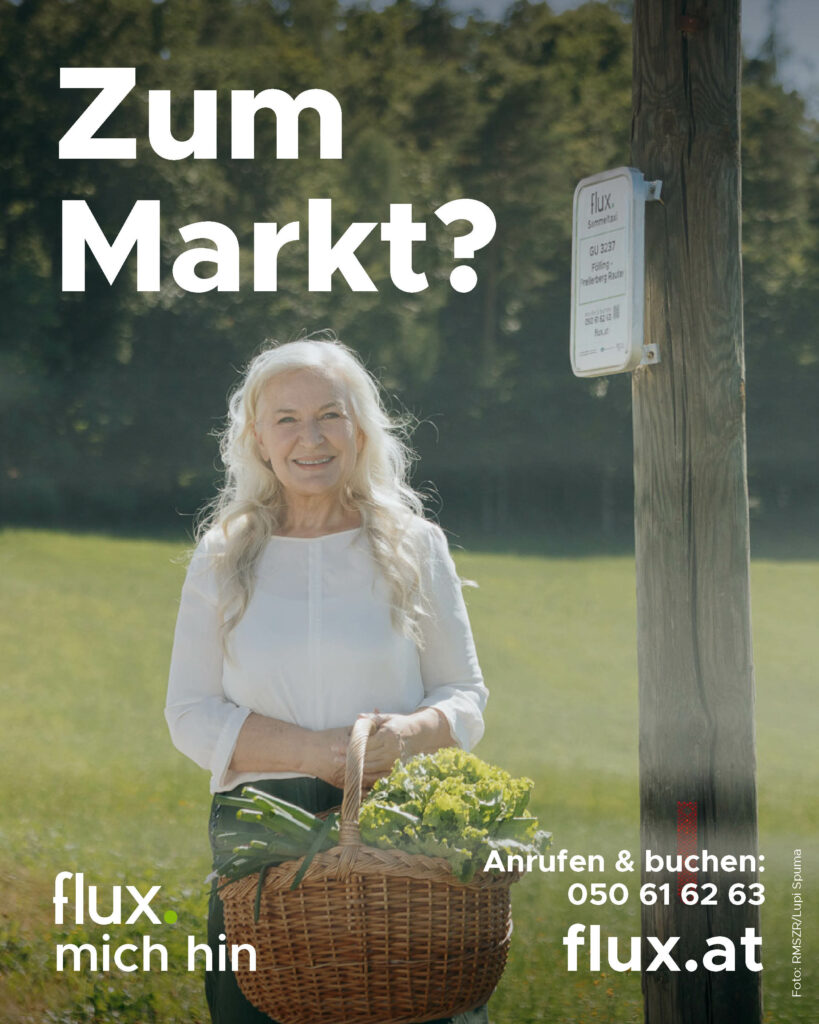 Buche deine flux.fahrt: telefonisch unter 050 61 62 63 oder online www.buchung.flux.at