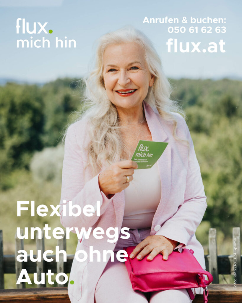 | Flexibel unterwegs auch ohne Auto mit flux. | Dein Sammeltaxi im Steirischen Zentralraum. flux. verbindet dich mit all dem, was du zum Leben brauchst. Deine flexible Ergänzung zu den Öffis. | Sharing is caring | Flexibel unterwegs – ohne Auto. Mit KlimaTicket fahrt ihr zum halben Preis. Das Sammeltaxi flux. ist täglich für euch da, auch an Feiertagen. Eure flexible Ergänzung zu den Öffis – damit alle zusammenkommen! |